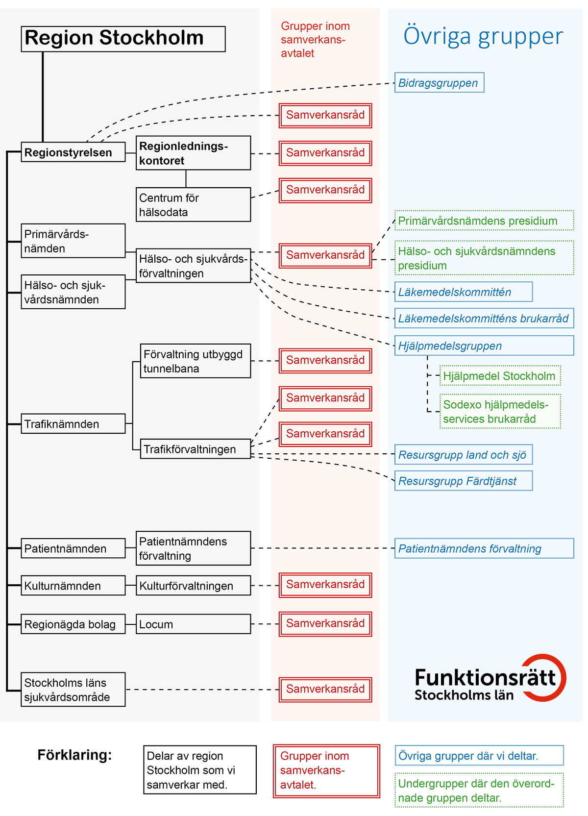 Vi har ett samverkansavtal med Region Stockholm som reglerar arbetet i samverkansråden. Avtalet innebär att förvaltningarna ska samverka med funktionsrättsorganisationerna minst fyra gånger per år. Det inkluderar även två resursgrupper, för frågor kring SL, Waxholmsbolaget och färdtjänst. All verksamhet i våra samverkansråd och andra grupper är intressepolitisk. Vi samarbetar även med de båda funktionsrättsorganisationerna DHR Region Stockholm och SRF Stockholm Gotland, som också har samverkansavtal med regionen.
